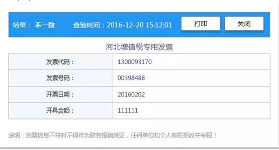 (2)發(fā)票狀態(tài)為作廢:納稅人輸入的發(fā)票校驗(yàn)信息與稅務(wù)機(jī)關(guān)電子信息一致,但發(fā)票已被發(fā)票開(kāi)具方做作廢處理,此發(fā)票不可作為財(cái)務(wù)報(bào)銷憑證。